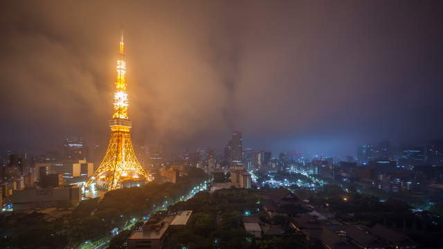 Zeitraffer Tokio Tower Weitwinkel bei Nacht.