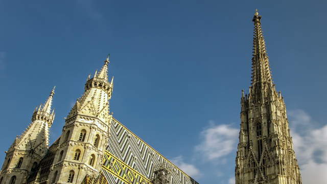 In diesem Zeitraffer bewegt sich die Kamera langsam zurück, während sie von einer halbnahen Einstellung auf den Stephansdom in Wien auf eine Totale zurück zoomt.